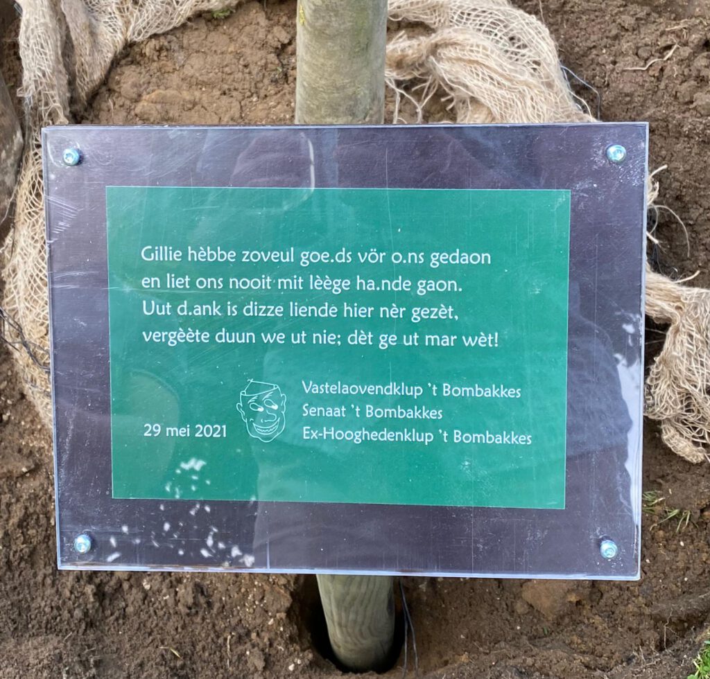 As da.nk vör en blie.vende herinnering ân de decennialange ondersteuning zien we mit ’t Bombakkes, de Senaat van ’t Bombakkes en de Ex-Hoogheden van ’t Bombakkes gistere bïj Bas en Maike unne liendebôm gaon pla.nte. Vergezeld dör en par korte woordjes van de Vörzitter van de Ex-Hoogheden, de Commandeur van de Senaat en de Vorst van ’t Bombakkes en bezèègend mit un goed glas bie.r kreeg d’n bôm un mój plétske ien d’n Hof. Uuteraard was d’r ôk vör un herinneringsplakkette gezörgd mit daorop unne tekst den ’t allemaol zét: